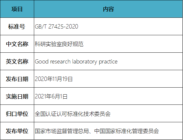 中国国家标准化管理委员会平台发布了《科研实验室良好规范》(GB/T27425-2020)标准,2021年06月01日起实施,此《科研实验室良好规范》规定了科研实验室良好规范(简称GRLP),包括管理要求和技术要求,是有关科研实验室运行、运行条件以及研究活动的计划、实施、检查、记录、存档和报告的一套规范体系,弥补了国内科研实验室良好规范领域的空白。